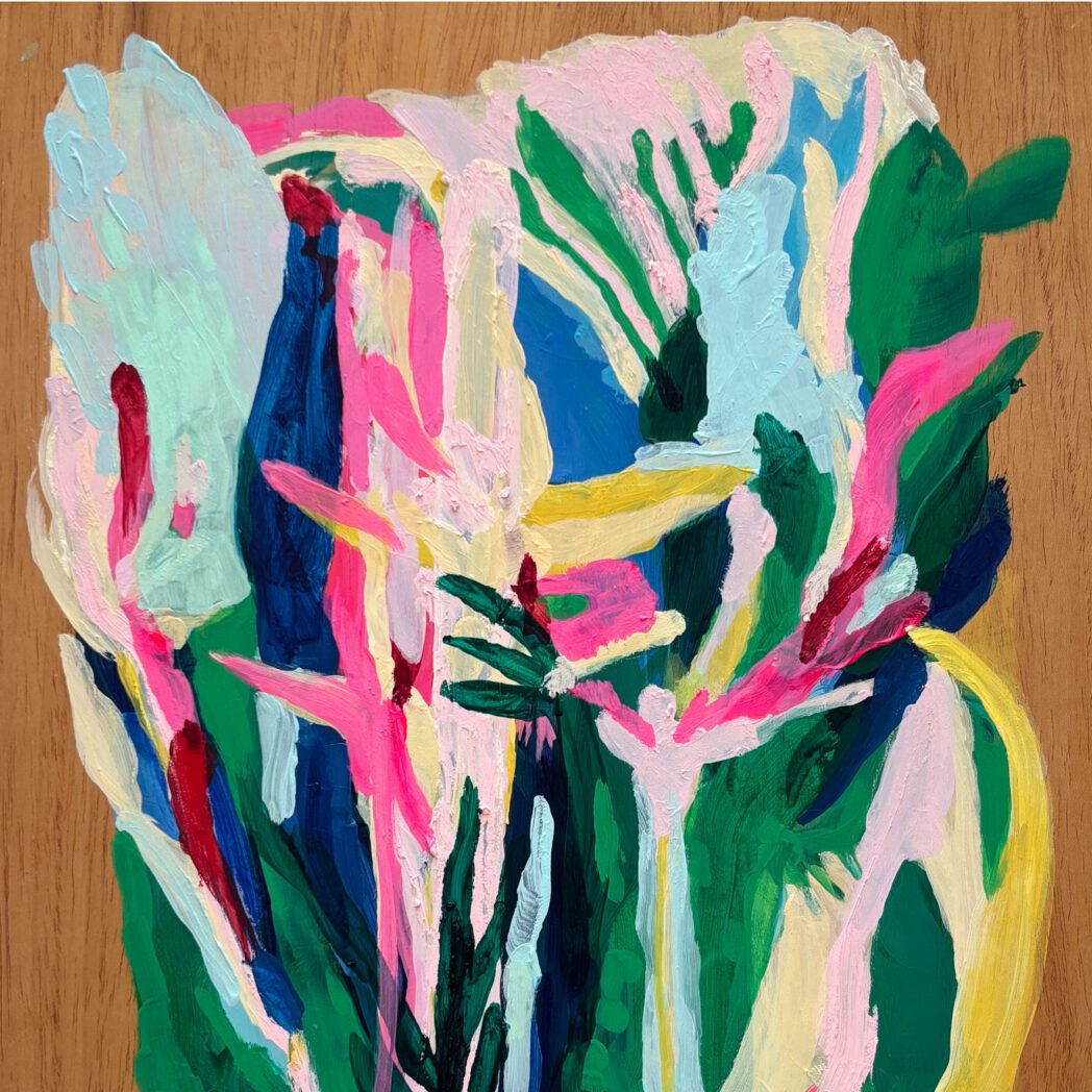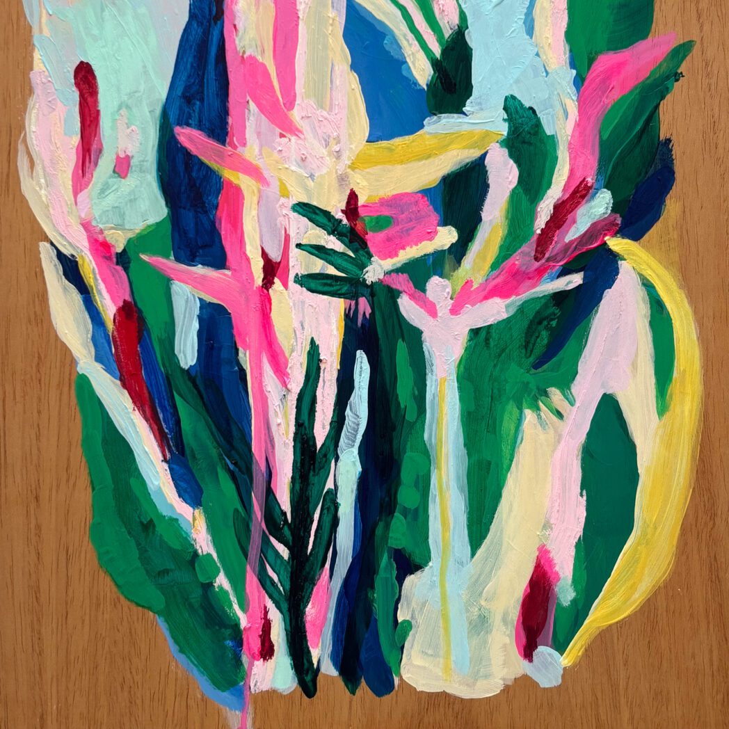 Acrílica e bastão a óleo sobre madeira.